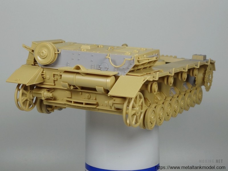 ▼4号的底盘承载能力有限,应付150mm重炮非常吃力,负重轮、尤其是前几对负重轮磨损非常严重,所以很多“灰熊”会把前几对负重轮换成全钢制负重轮,甚至有全换钢轮的案例。笔者这里参考说明书里B方案,前4对使用钢轮