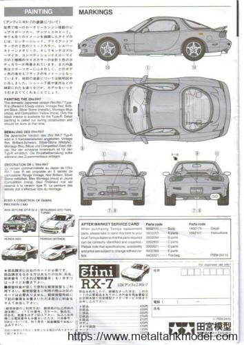 这款车水贴很少,无发动机内构,适合练手,但车窗遮盖有一定难度(车窗没有边框,对刀法要求很高,我颇感艰难) 封面彩绘很漂亮,但我更喜欢黑色的 说明书用扫描仪扫描 1 2 3 下一页 本文固定链接: https://www.metaltankmodel.com/modeltest/tamiya/开盒评测田宫-124马自达efini-rx-7跑车24110-封绘及说明书/ 转载请注明: dcbbk 2017年09月23日 于 制作坦克模型记录 发表 最后编辑:2018-12-06作者:dcbbk 这个作者貌似有点懒,什么都没有留下。 站内专栏
